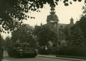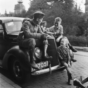 “Opeens evenwel constateerde ik haar als in een bliksemflits: Die ster daar voor op dat gevaarte, dat was de invasiester… Een schok doorsidderde me en als vastgenageld aan de grond bleef ik staan! Als gebiologeerd stond ik daar te kijken: Daar naderde één, daar naderden twee Engelse tanks! Dat ze gevolgd werden door enige Engelse legerauto’s, waarin Britse soldaten en ook Nederlandse B.S.’ers [Binnenlandse Strijdkrachten] zaten, het ontging me de eerste ogenblikken volkomen. Die monstrueuze gevaarten, waaruit voor iedere vijand dreigend korte kanonslopen naar voren staken, werden voor me het symbool der bevrijding. Heb ik aanvankelijk gelachen of gehuild? Ik weet het niet! Wel weet ik dat ik later heb gezwaaid, gedanst en gejuicht en met mij zwaaiden, dansten en juichten anderen, die, Joost mag weten, overal vandaan waren gekomen… Er waren er al heel wat onder hen, die met oranje waren getooid! Hoe was dat mogelijk? Oranje, de kleur der zo geliefde en begeerde vrijheid! En als gefascineerd door die kolossen begonnen we achter de stoet, die zich vrij snel voorwaarts bewoog, aan te hollen.”