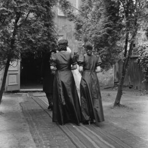 Op deze foto zien we het binnenplaatsje van de Osse synagoge tijdens het huwelijk van Nathan Andriesse en Clara Haagens op 25 augustus 1941. Het hoofdgebouw van de synagoge, met de openstaande deuren, is na de oorlog gesloopt, de monumentale gevel van het voorgebouw is nog steeds aan de Koornstraat te vinden. Veel van de aanwezigen bij dit huwelijk zijn tijdens de Tweede Wereldoorlog omgekomen, zo ook de hoofdpersonen: Nathan en Clara werden op 31 januari 1944 in Auschwitz vermoord. Hun in 1942 geboren zoon Samuel (“Miel”) heeft de oorlog via de onderduik wel overleefd.